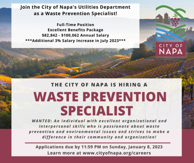 纳帕市目前正在招聘废物预防专家职位。加入NAPA的团队,帮助我们的社区回收,堆肥和减少浪费!